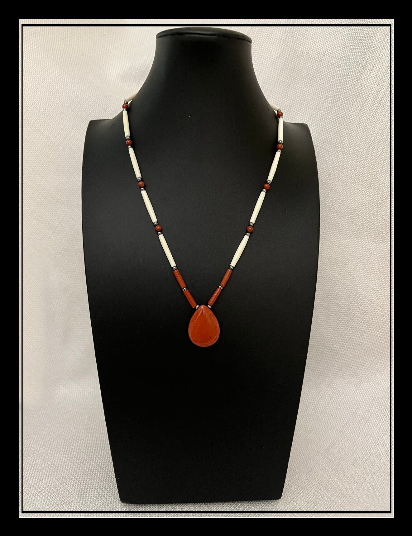 Red jasper beads, red jasper teardrop, bone hairpipe and deerhide.
