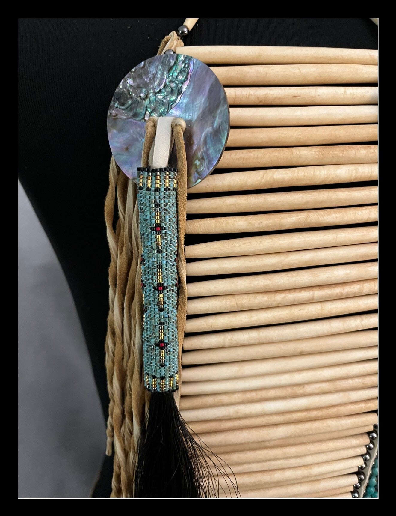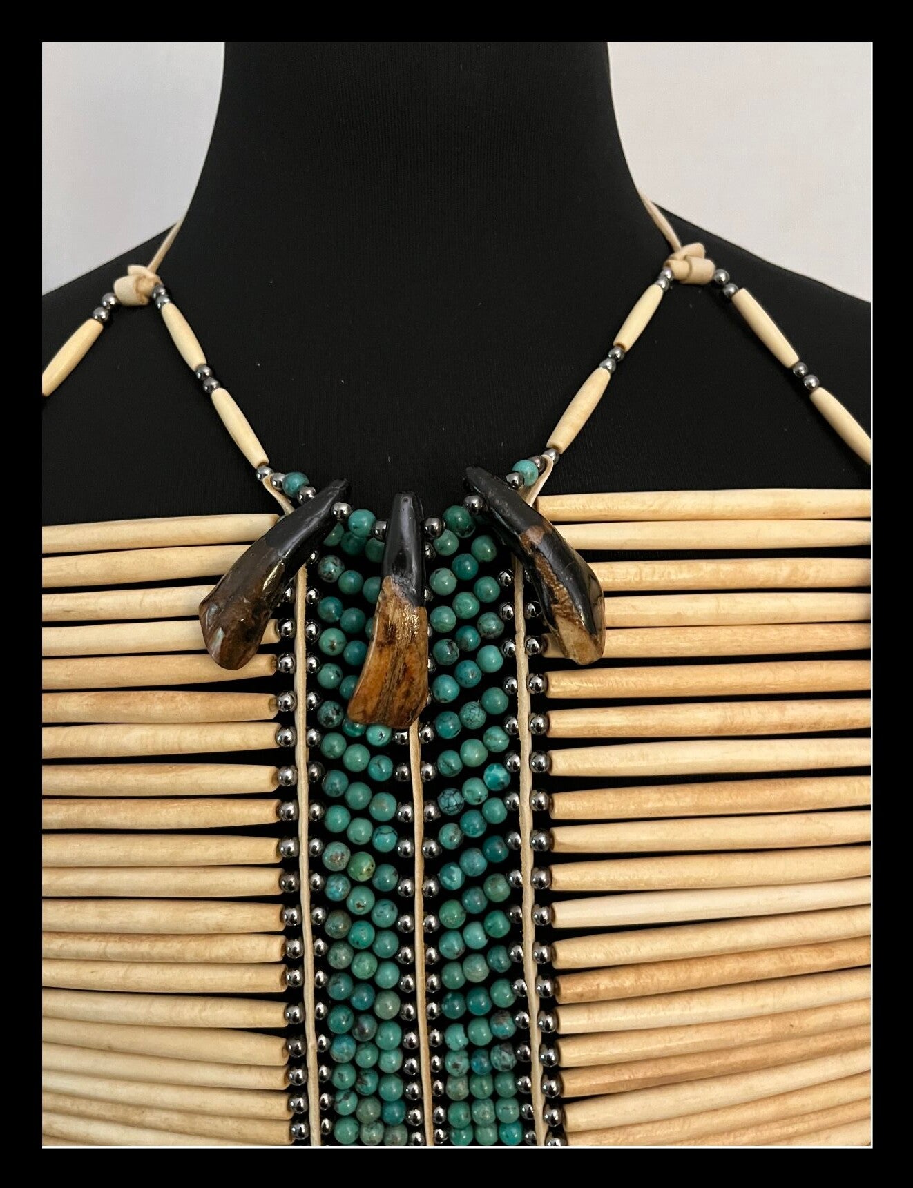 26"L x 13"W including fringe (not including neck tie). Made with bone hairpipe, turquoise gemstones, horse hair, 11/0 glass beads, abalone buttons, dyed buffalo teeth, deer hide and synthetic sinew