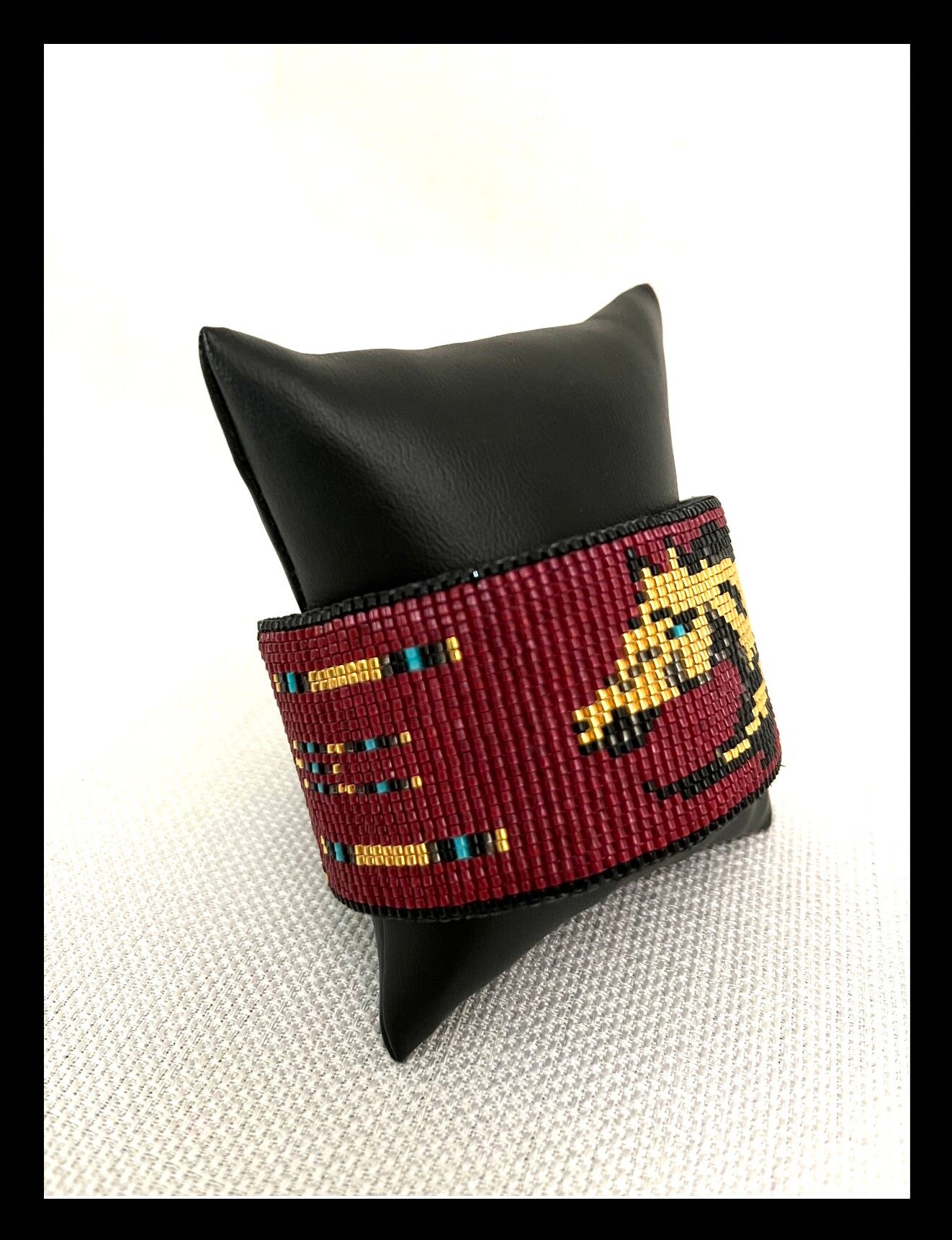 This is not loom work. Cuff is beaded using my signature modified square stitch for added strength and durability. 11/0 Delica beads with 24kt light gold beads, 100% silk thread, metal cuff, deerhide backing.