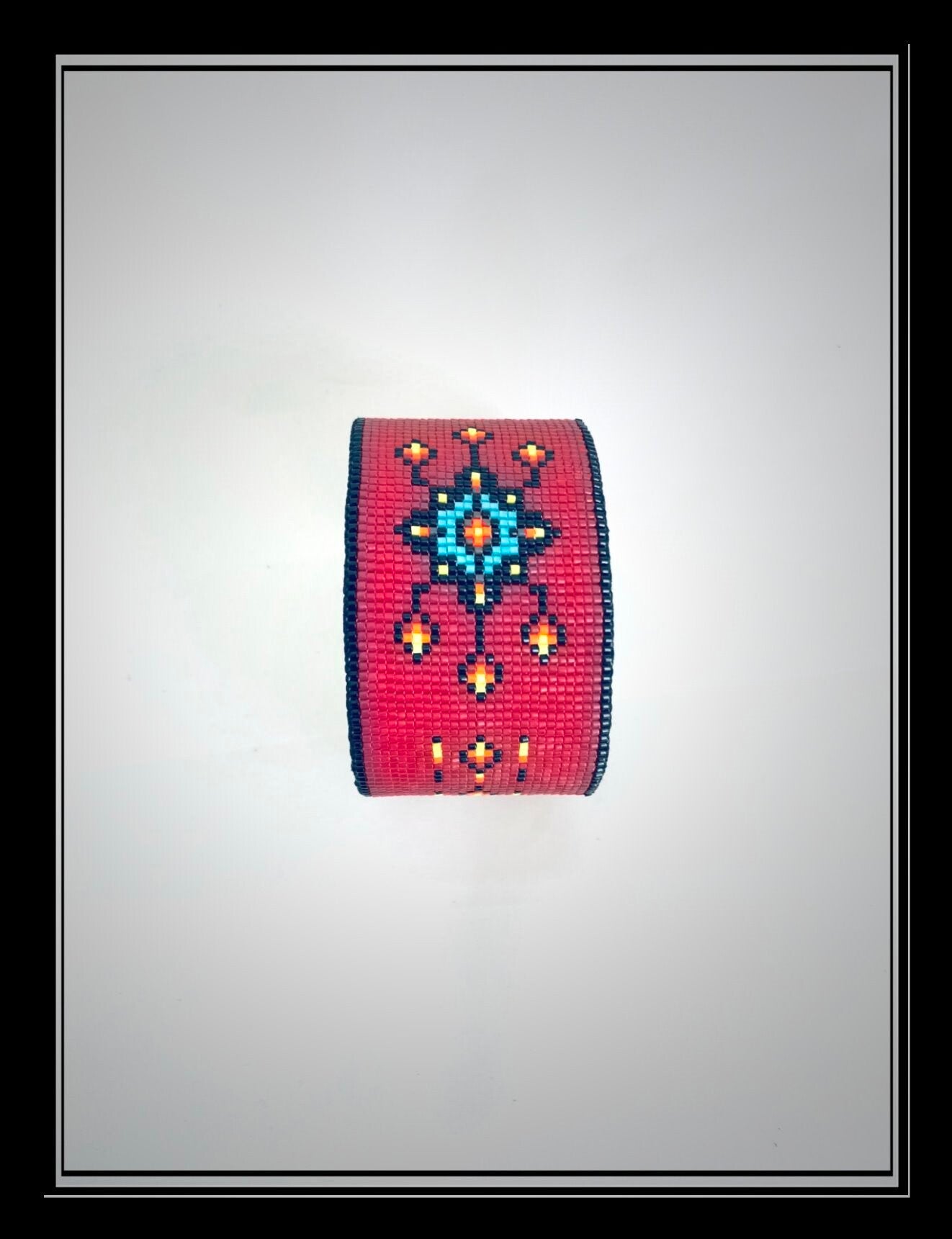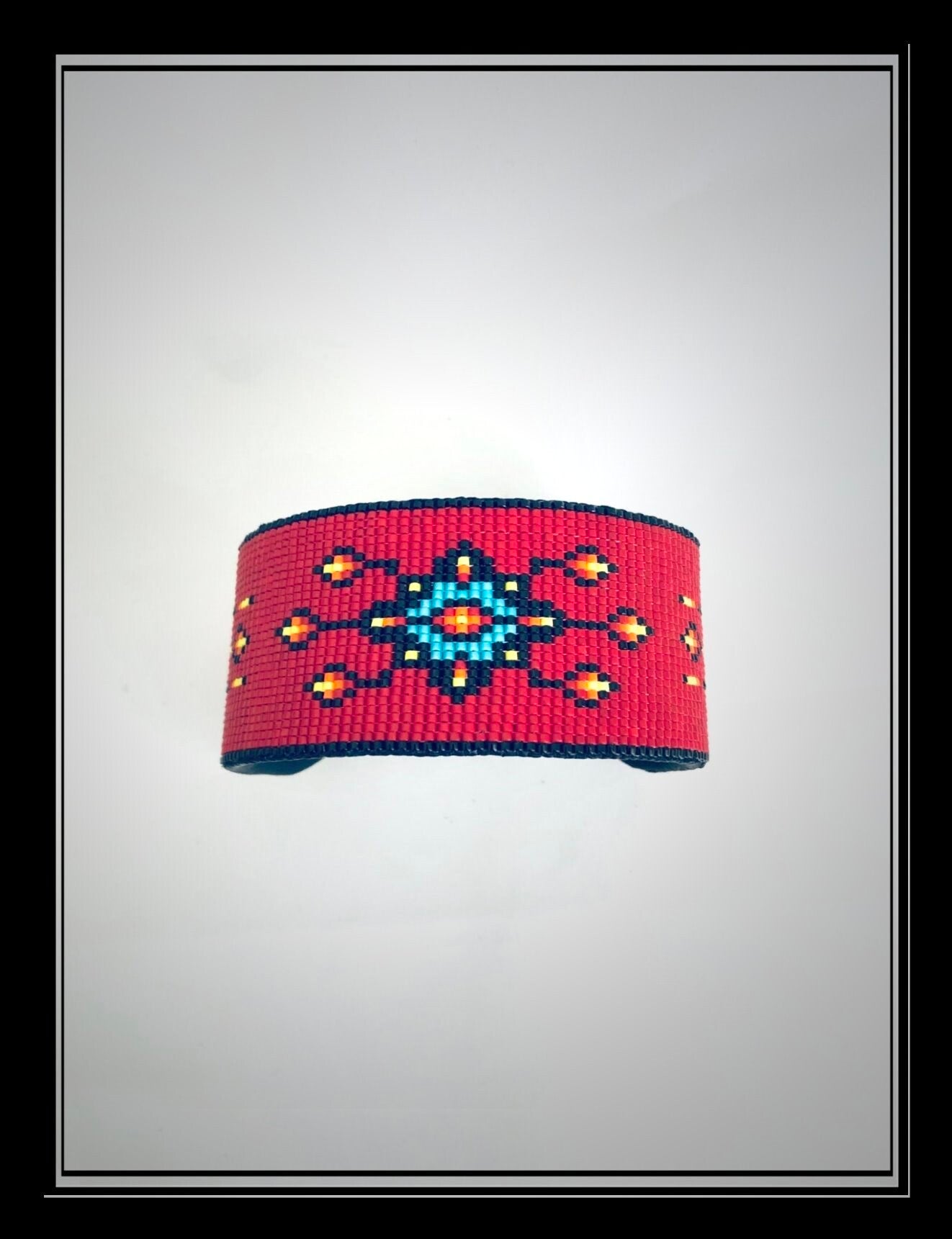 This is not loom work. Cuff is beaded using my signature modified square stitch for added strength and durability. 11/0 Delica beads, 100% silk thread, metal cuff, deerhide backing.